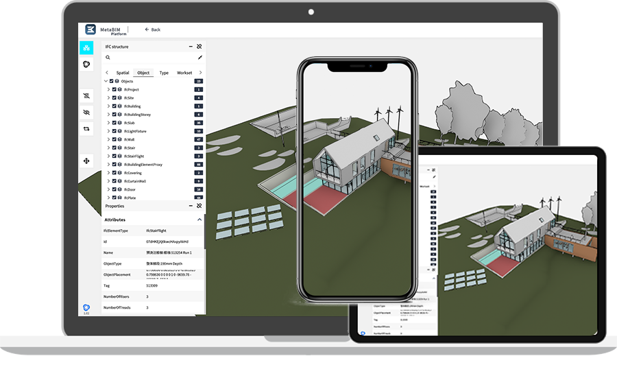 MetaBIM backend process service parses BIM assets into objects without losing data integrity, by working with metadata objects, MetaBIM can generate geometry and properties in real-time systems.